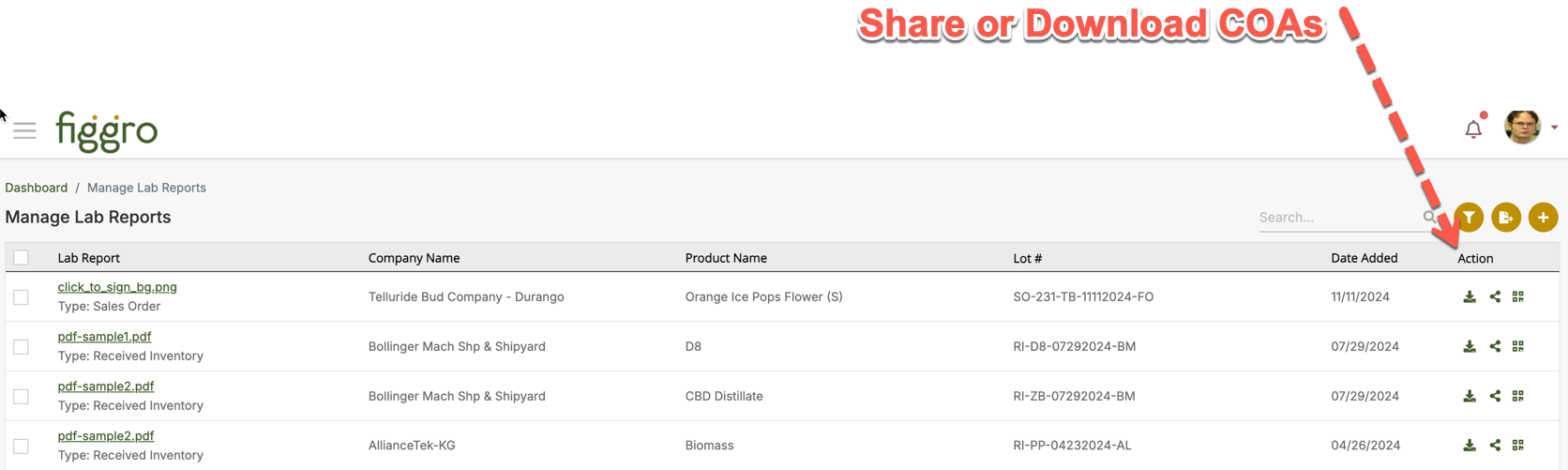 COAs remain in secure cloud storage for audit trails, with version history and expiration dates and can be found under the Chain of Custody Module---> Manage Lab Reports sub module.